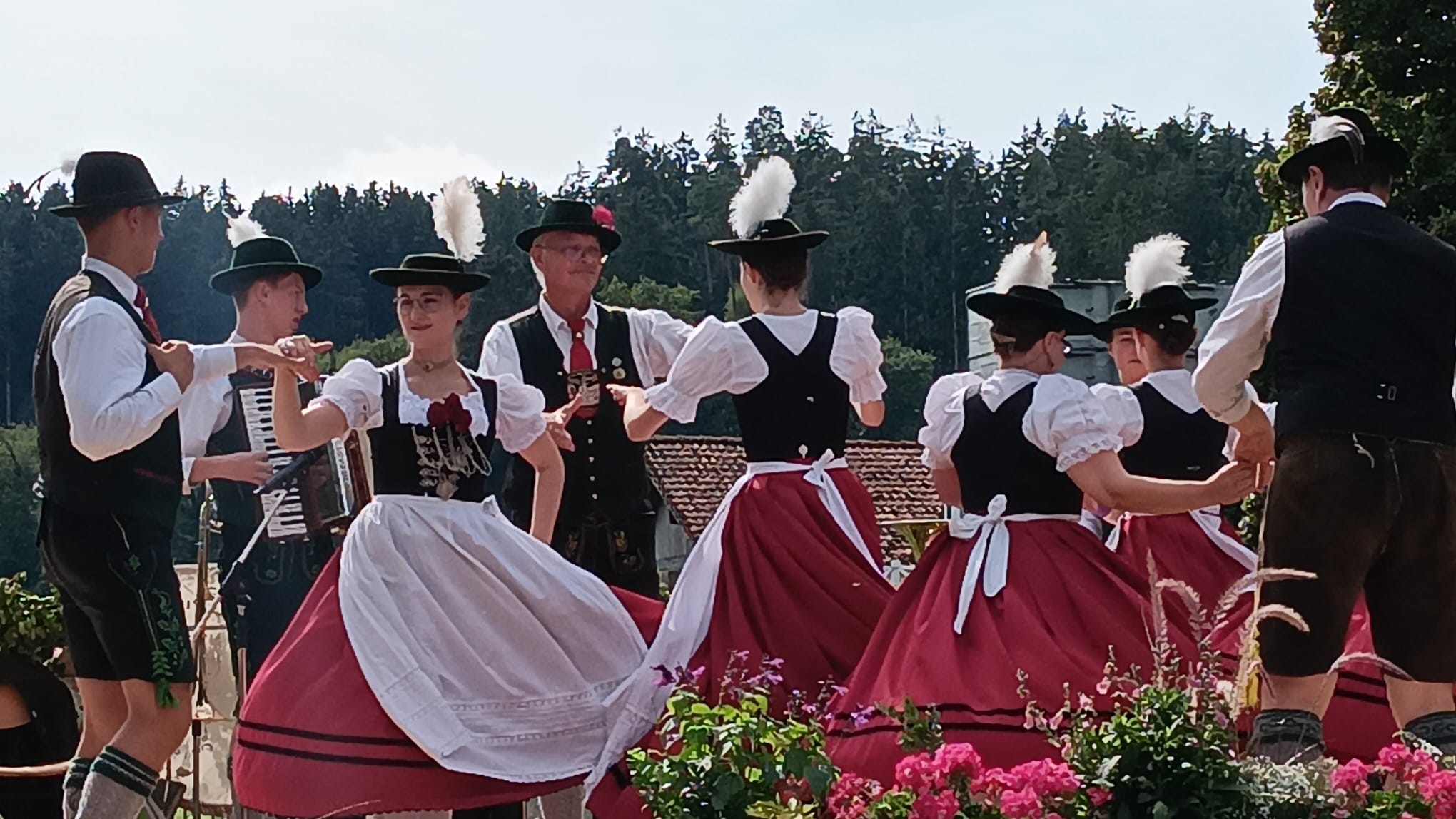 Am 28.06.25 gratulierten de Goldachtaler Eicherloh seinen 1. Vorstand an Done Kollmannsberger zum 60. Geburtstag gebührend mit an Tanzauftritt vo da Jugend, de Aktiven mit an Plattler, de Erwachsenen mit an Sterntanz und de Theatergruppn mit an Einakter.