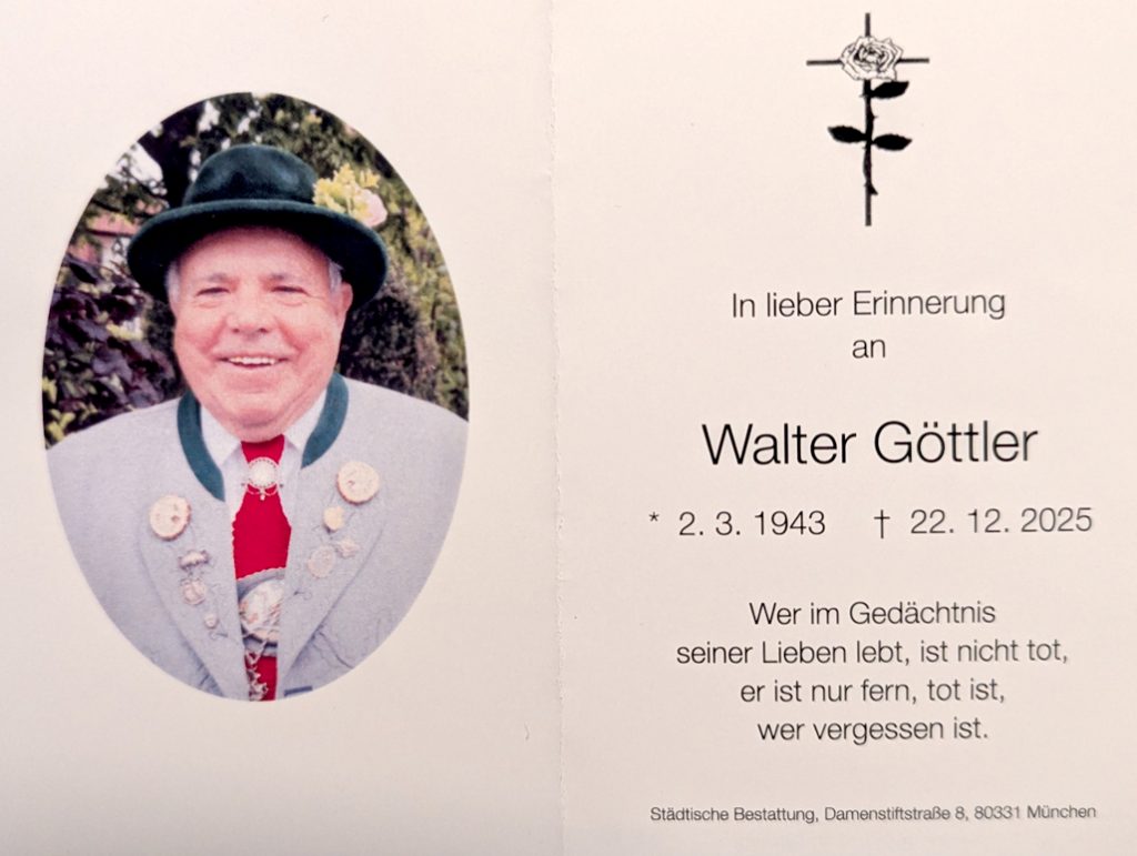 Am 22.12.2025 verstarb unser Ehrenmitglied und 2. Vorstand Walter Göttler nach kurzer schwerer Krankheit im Alter von 82 Jahren. Walter war eine tragende Säule unseres Vereins. Seine Ämter erfüllte er stets gewissenhaft und zum Wohle des Vereins. Seit über 38 Jahren begleitete Walter mit Stolz unsere beiden Vereinsfahnen. Mit Ruhe und Bedacht war er steht’s ein vorbildlicher Trachtler, deshalb wurde er 2013 mit den goldenen Gauehrenzeichen vom Isargau München geehrt. 2019 bekam er die Auszeichnung für Männer und Frauen im Ehrenamt vom Bayerischen Ministerpräsidenten.